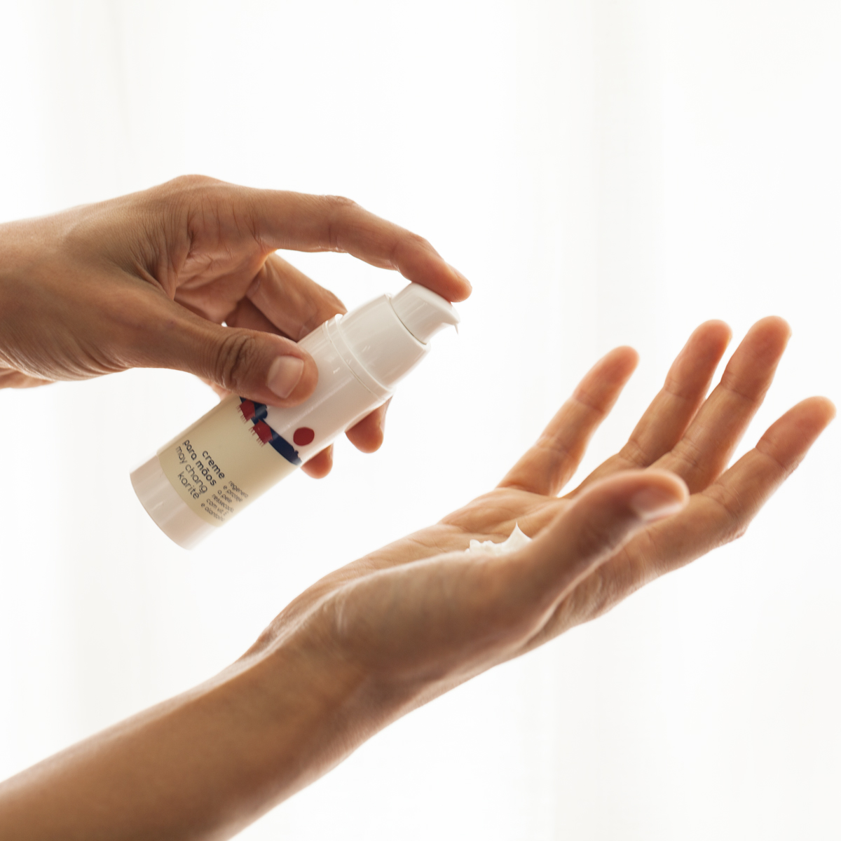 Pressione a válvula duas vezes e espalhe o creme nas palmas e no dorso das mãos. Para potencializar os efeitos calmantes dos óleos essenciais, inale profundamente as mãos logo após a aplicação.